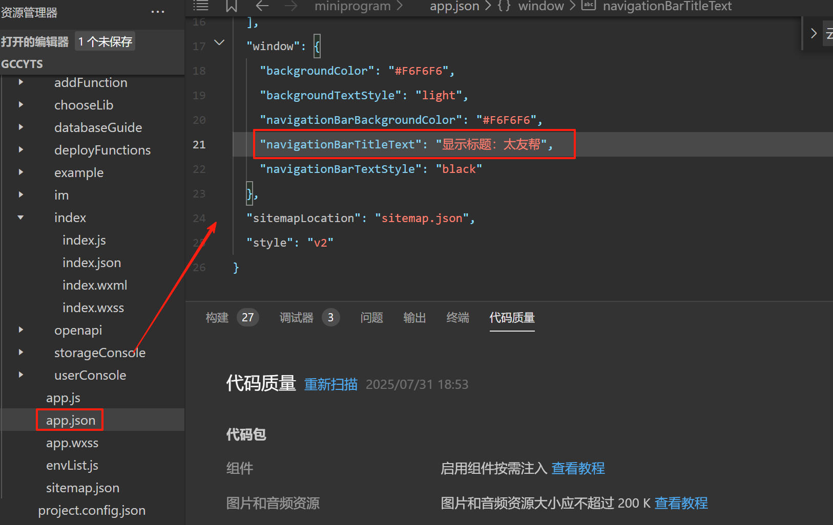 4、app.json修改下跳转时的显示标题